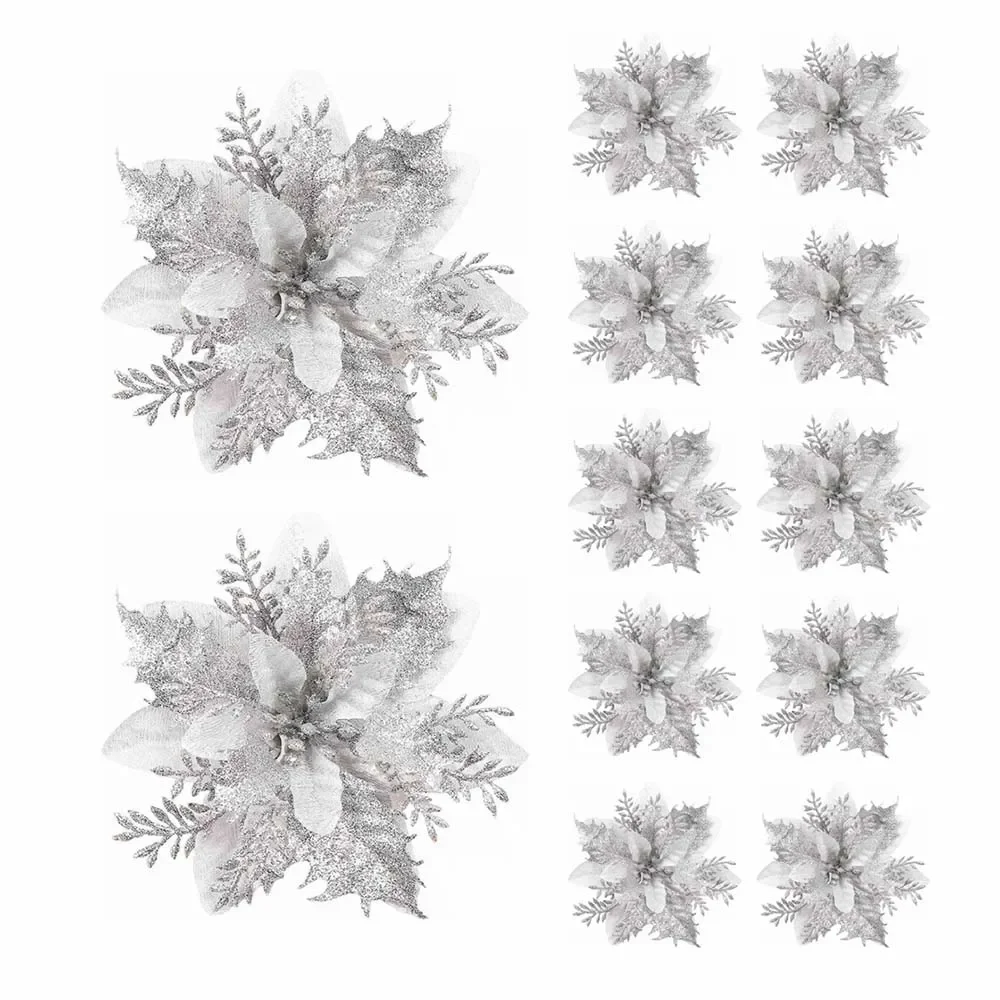 14cm Christmas Glitter Poinsettia Flower Ornaments – Gold, Red, Silver & Mixed Colors | Holiday Tree & Home Decoration